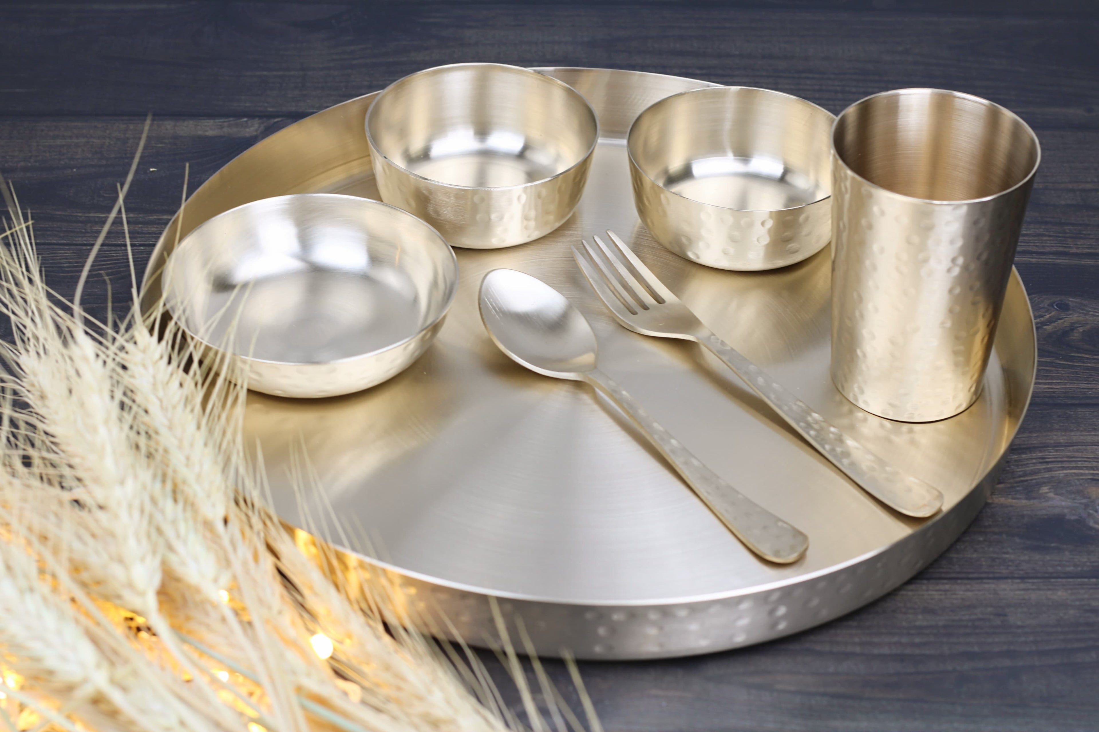 Hand-Hammered Bronze Thali Set – 7-Piece Artisan Dinnerware | Kansyakar Signature Series