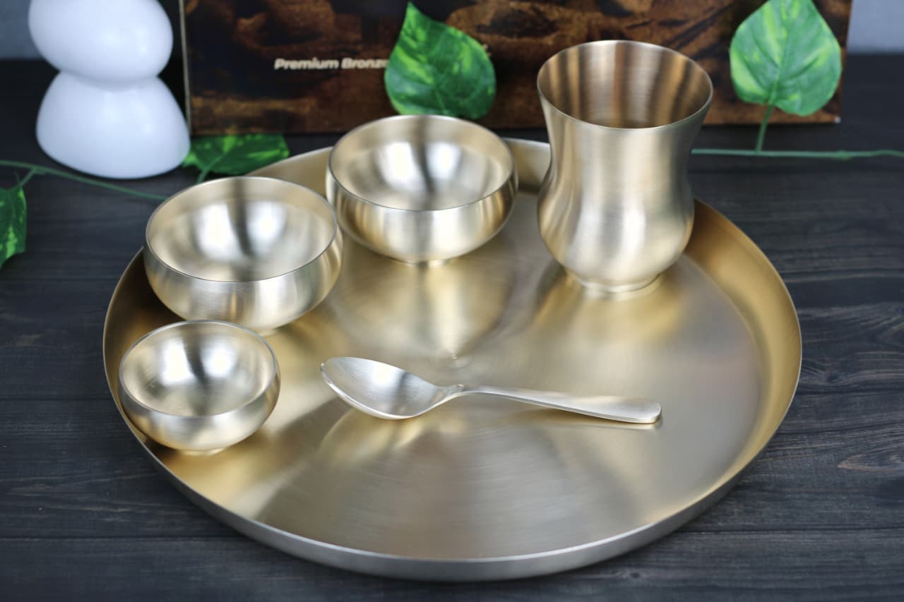 Bring timeless elegance to your dining table with the Kansyakar Bronze Curvy Dinner Set. Handcrafted from 100% pure bronze and available in a sophisticated matte finish, this 6-piece set combines tradition, luxury, and health. Free from lead (Pb) and antimony (Sb), it is available in two plate sizes (11 in & 12 in), making it perfect for everyday dining, festive occasions, and premium gifting.